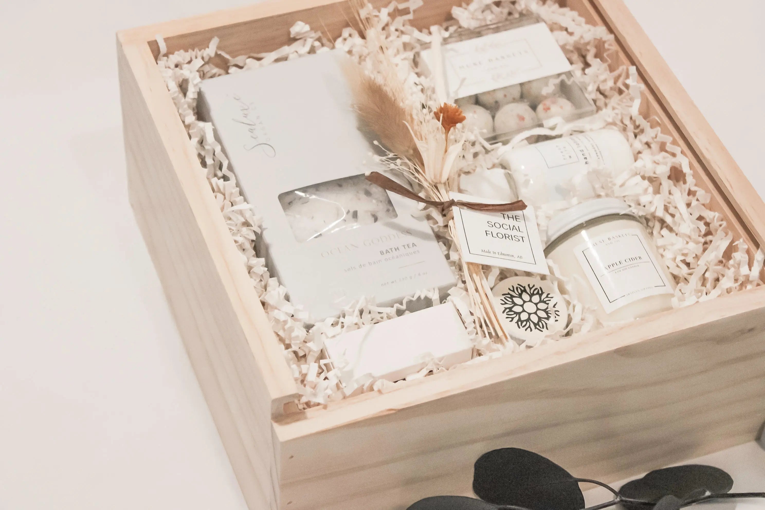 • Enclosed in our signature luxe pine Wood Gift box (made locally in Langley, B.C.), which is beautifully presented with a grosgrain or satin ribbon, gift tag, and a handwritten note card to add a personal touch.